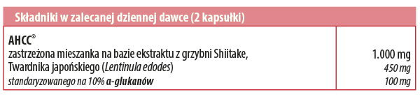 AHCC zastrzeżona mieszanka na bazie standaryzowanego ekstraktu z grzybni shiitake, Twardnika japońskiego (Lentinula edodes), substancja przeciewbrylająca (kwasy tłuszczowe), substancja zagęszczająca (dekstryna), substancja wypełniająca (celuloza mikrokrystaliczna) i alfa-cyklodekstryna. Środek przeciwbrylający (stearynian magnezu). Kapsułka roślinna: Hydroksypropylometyloceluloza, barwnik (węglan magnezu).